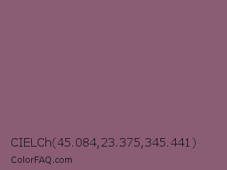 CIELCh 45.084,23.375,345.441 Color is a normal rose color and the nearest color is Mauve Taupe #915f6d. Hex code #8b5d75 and RGB value is rgb(139,93,117). In RGB color space, this color is composed of 55% red, 36% green, 46% blue, In CMYK color space, this color is composed of 0% cyan, 33% magenta, 16% yellow , 45% black , In HSL color space, this color has a hue angle of 329° , 20% saturation and 45% lightness.