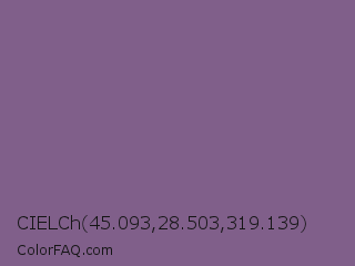CIELCh 45.093,28.503,319.139 Color is a normal purple color and the nearest color is Chinese Violet #856088. Hex code #805f8a and RGB value is rgb(128,95,138). In RGB color space, this color is composed of 50% red, 37% green, 54% blue, In CMYK color space, this color is composed of 7% cyan, 31% magenta, 0% yellow , 46% black , In HSL color space, this color has a hue angle of 286° , 18% saturation and 46% lightness.
