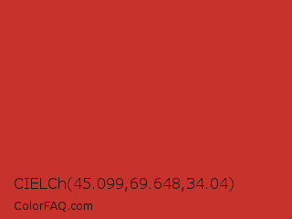 CIELCh 45.099,69.648,34.04 Color is a normal red color and the nearest color is Persian Red #cc3333. Hex code #c7322d and RGB value is rgb(199,50,45). In RGB color space, this color is composed of 78% red, 20% green, 18% blue, In CMYK color space, this color is composed of 0% cyan, 75% magenta, 77% yellow , 22% black , In HSL color space, this color has a hue angle of 2° , 63% saturation and 48% lightness.