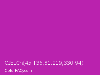 CIELCh 45.136,81.219,330.94 Color is a normal magenta color and the nearest color is Byzantine #bd33a4. Hex code #ba22ae and RGB value is rgb(186,34,174). In RGB color space, this color is composed of 73% red, 13% green, 68% blue, In CMYK color space, this color is composed of 0% cyan, 82% magenta, 6% yellow , 27% black , In HSL color space, this color has a hue angle of 305° , 69% saturation and 43% lightness.