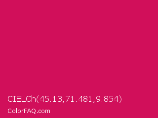 CIELCh 45.13,71.481,9.854 Color is a normal rose color and the nearest color is Debian Red #d70a53. Hex code #d10f5a and RGB value is rgb(209,15,90). In RGB color space, this color is composed of 82% red, 6% green, 35% blue, In CMYK color space, this color is composed of 0% cyan, 93% magenta, 57% yellow , 18% black , In HSL color space, this color has a hue angle of 337° , 87% saturation and 44% lightness.