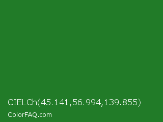 CIELCh 45.141,56.994,139.855 Color is a normal green color and the nearest color is Forest Green #228b22. Hex code #217b28 and RGB value is rgb(33,123,40). In RGB color space, this color is composed of 13% red, 48% green, 16% blue, In CMYK color space, this color is composed of 73% cyan, 0% magenta, 67% yellow , 52% black , In HSL color space, this color has a hue angle of 125° , 58% saturation and 31% lightness.