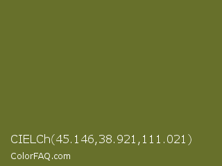 CIELCh 45.146,38.921,111.021 Color is a dark yellow color and the nearest color is Fern Frond #657220. Hex code #67702b and RGB value is rgb(103,112,43). In RGB color space, this color is composed of 40% red, 44% green, 17% blue, In CMYK color space, this color is composed of 8% cyan, 0% magenta, 62% yellow , 56% black , In HSL color space, this color has a hue angle of 68° , 45% saturation and 30% lightness.