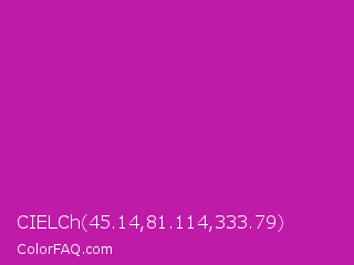 CIELCh 45.14,81.114,333.79 Color is a normal magenta color and the nearest color is Byzantine #bd33a4. Hex code #bf1aa8 and RGB value is rgb(191,26,168). In RGB color space, this color is composed of 75% red, 10% green, 66% blue, In CMYK color space, this color is composed of 0% cyan, 86% magenta, 12% yellow , 25% black , In HSL color space, this color has a hue angle of 308° , 76% saturation and 43% lightness.