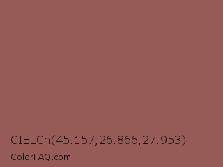 CIELCh 45.157,26.866,27.953 Color is a normal red color and the nearest color is Au Chico #97605d. Hex code #965b57 and RGB value is rgb(150,91,87). In RGB color space, this color is composed of 59% red, 36% green, 34% blue, In CMYK color space, this color is composed of 0% cyan, 39% magenta, 42% yellow , 41% black , In HSL color space, this color has a hue angle of 4° , 27% saturation and 46% lightness.
