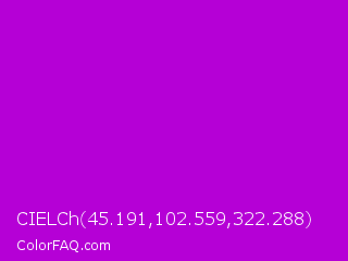 CIELCh 45.191,102.559,322.288 Color is a normal purple color and the nearest color is Vivid Mulberry #b80ce3. Hex code #b500d6 and RGB value is rgb(181,0,214). In RGB color space, this color is composed of 71% red, 0% green, 84% blue, In CMYK color space, this color is composed of 15% cyan, 100% magenta, 0% yellow , 16% black , In HSL color space, this color has a hue angle of 291° , 100% saturation and 42% lightness.