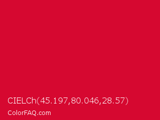 CIELCh 45.197,80.046,28.57 Color is a normal red color and the nearest color is Medium Candy Apple Red #e2062c. Hex code #d60830 and RGB value is rgb(214,8,48). In RGB color space, this color is composed of 84% red, 3% green, 19% blue, In CMYK color space, this color is composed of 0% cyan, 96% magenta, 78% yellow , 16% black , In HSL color space, this color has a hue angle of 348° , 93% saturation and 44% lightness.