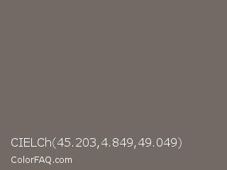 CIELCh 45.203,4.849,49.049 Color is a normal orange color and the nearest color is Flint #6f6a61. Hex code #736965 and RGB value is rgb(115,105,101). In RGB color space, this color is composed of 45% red, 41% green, 40% blue, In CMYK color space, this color is composed of 0% cyan, 9% magenta, 12% yellow , 55% black , In HSL color space, this color has a hue angle of 17° , 6% saturation and 42% lightness.