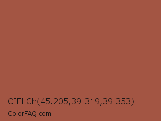 CIELCh 45.205,39.319,39.353 Color is a normal red color and the nearest color is Sepia Skin #9e5b40. Hex code #a35543 and RGB value is rgb(163,85,67). In RGB color space, this color is composed of 64% red, 33% green, 26% blue, In CMYK color space, this color is composed of 0% cyan, 48% magenta, 59% yellow , 36% black , In HSL color space, this color has a hue angle of 11° , 42% saturation and 45% lightness.