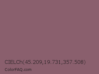 CIELCh 45.209,19.731,357.508 Color is a normal rose color and the nearest color is Mauve Taupe #915f6d. Hex code #8a5f6d and RGB value is rgb(138,95,109). In RGB color space, this color is composed of 54% red, 37% green, 43% blue, In CMYK color space, this color is composed of 0% cyan, 31% magenta, 21% yellow , 46% black , In HSL color space, this color has a hue angle of 340° , 18% saturation and 46% lightness.