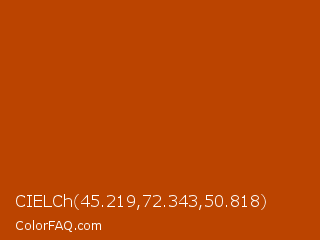 CIELCh 45.219,72.343,50.818 Color is a normal orange color and the nearest color is Mahogany #c04000. Hex code #bb4400 and RGB value is rgb(187,68,0). In RGB color space, this color is composed of 73% red, 27% green, 0% blue, In CMYK color space, this color is composed of 0% cyan, 64% magenta, 100% yellow , 27% black , In HSL color space, this color has a hue angle of 22° , 100% saturation and 37% lightness.