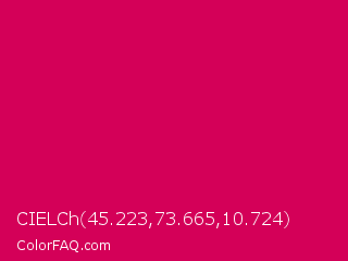 CIELCh 45.223,73.665,10.724 Color is a normal rose color and the nearest color is Rubine Red #d10056. Hex code #d40058 and RGB value is rgb(212,0,88). In RGB color space, this color is composed of 83% red, 0% green, 35% blue, In CMYK color space, this color is composed of 0% cyan, 100% magenta, 58% yellow , 17% black , In HSL color space, this color has a hue angle of 335° , 100% saturation and 42% lightness.