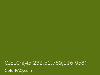 CIELCh 45.232,51.789,116.958 Color is a dark lime color and the nearest color is Fern Frond #657220. Hex code #5a7412 and RGB value is rgb(90,116,18). In RGB color space, this color is composed of 35% red, 45% green, 7% blue, In CMYK color space, this color is composed of 22% cyan, 0% magenta, 84% yellow , 55% black , In HSL color space, this color has a hue angle of 76° , 73% saturation and 26% lightness.