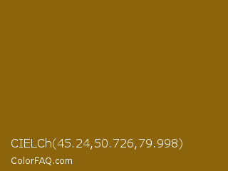 CIELCh 45.24,50.726,79.998 Color is a dark orange color and the nearest color is Corn Harvest #8b6b0b. Hex code #8c640b and RGB value is rgb(140,100,11). In RGB color space, this color is composed of 55% red, 39% green, 4% blue, In CMYK color space, this color is composed of 0% cyan, 29% magenta, 92% yellow , 45% black , In HSL color space, this color has a hue angle of 41° , 85% saturation and 30% lightness.