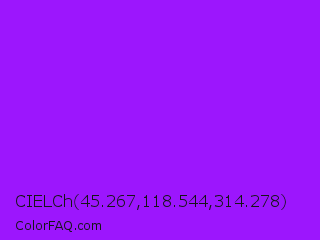 CIELCh 45.267,118.544,314.278 Color is a normal purple color and the nearest color is Veronica #a020f0. Hex code #9c16fd and RGB value is rgb(156,22,253). In RGB color space, this color is composed of 61% red, 9% green, 99% blue, In CMYK color space, this color is composed of 38% cyan, 91% magenta, 0% yellow , 1% black , In HSL color space, this color has a hue angle of 275° , 98% saturation and 54% lightness.