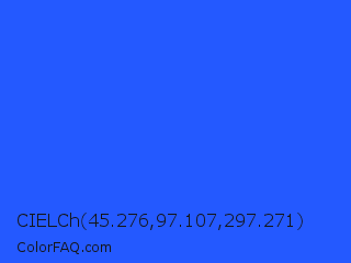CIELCh 45.276,97.107,297.271 Color is a normal blue color and the nearest color is Blue Crayola #1f75fe. Hex code #2459ff and RGB value is rgb(36,89,255). In RGB color space, this color is composed of 14% red, 35% green, 100% blue, In CMYK color space, this color is composed of 86% cyan, 65% magenta, 0% yellow , 0% black , In HSL color space, this color has a hue angle of 225° , 100% saturation and 57% lightness.