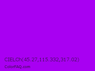 CIELCh 45.27,115.332,317.02 Color is a normal purple color and the nearest color is Vivid Violet #9f00ff. Hex code #a800f2 and RGB value is rgb(168,0,242). In RGB color space, this color is composed of 66% red, 0% green, 95% blue, In CMYK color space, this color is composed of 31% cyan, 100% magenta, 0% yellow , 5% black , In HSL color space, this color has a hue angle of 282° , 100% saturation and 47% lightness.