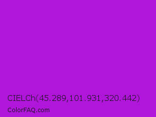 CIELCh 45.289,101.931,320.442 Color is a normal purple color and the nearest color is Vivid Mulberry #b80ce3. Hex code #af16da and RGB value is rgb(175,22,218). In RGB color space, this color is composed of 69% red, 9% green, 85% blue, In CMYK color space, this color is composed of 20% cyan, 90% magenta, 0% yellow , 15% black , In HSL color space, this color has a hue angle of 287° , 82% saturation and 47% lightness.