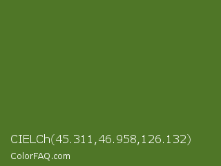 CIELCh 45.311,46.958,126.132 Color is a normal green color and the nearest color is Sap Green #507d2a. Hex code #4f7627 and RGB value is rgb(79,118,39). In RGB color space, this color is composed of 31% red, 46% green, 15% blue, In CMYK color space, this color is composed of 33% cyan, 0% magenta, 67% yellow , 54% black , In HSL color space, this color has a hue angle of 90° , 50% saturation and 31% lightness.