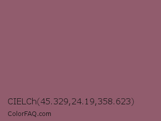 CIELCh 45.329,24.19,358.623 Color is a normal rose color and the nearest color is Mauve Taupe #915f6d. Hex code #915c6d and RGB value is rgb(145,92,109). In RGB color space, this color is composed of 57% red, 36% green, 43% blue, In CMYK color space, this color is composed of 0% cyan, 37% magenta, 25% yellow , 43% black , In HSL color space, this color has a hue angle of 341° , 22% saturation and 46% lightness.