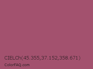 CIELCh 45.355,37.152,358.671 Color is a normal rose color and the nearest color is China Rose #a8516e. Hex code #a3516e and RGB value is rgb(163,81,110). In RGB color space, this color is composed of 64% red, 32% green, 43% blue, In CMYK color space, this color is composed of 0% cyan, 50% magenta, 33% yellow , 36% black , In HSL color space, this color has a hue angle of 339° , 34% saturation and 48% lightness.