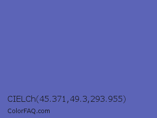 CIELCh 45.371,49.3,293.955 Color is a normal blue color and the nearest color is Blue Violet #6456b7. Hex code #5c64b7 and RGB value is rgb(92,100,183). In RGB color space, this color is composed of 36% red, 39% green, 72% blue, In CMYK color space, this color is composed of 50% cyan, 45% magenta, 0% yellow , 28% black , In HSL color space, this color has a hue angle of 235° , 39% saturation and 54% lightness.