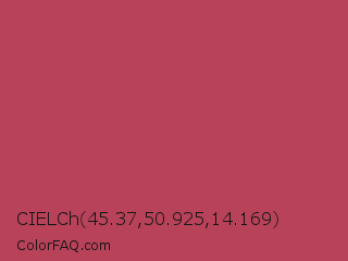 CIELCh 45.37,50.925,14.169 Color is a normal red color and the nearest color is Hippie Pink #ae4560. Hex code #b84259 and RGB value is rgb(184,66,89). In RGB color space, this color is composed of 72% red, 26% green, 35% blue, In CMYK color space, this color is composed of 0% cyan, 64% magenta, 52% yellow , 28% black , In HSL color space, this color has a hue angle of 348° , 47% saturation and 49% lightness.