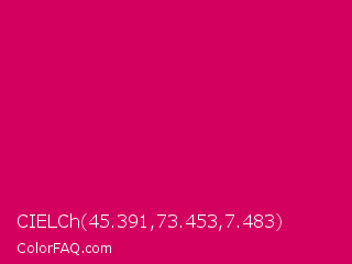CIELCh 45.391,73.453,7.483 Color is a normal rose color and the nearest color is Rubine Red #d10056. Hex code #d4005f and RGB value is rgb(212,0,95). In RGB color space, this color is composed of 83% red, 0% green, 37% blue, In CMYK color space, this color is composed of 0% cyan, 100% magenta, 55% yellow , 17% black , In HSL color space, this color has a hue angle of 333° , 100% saturation and 42% lightness.