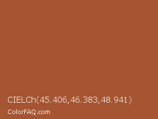 CIELCh 45.406,46.383,48.941 Color is a normal orange color and the nearest color is Paarl #a65529. Hex code #a65532 and RGB value is rgb(166,85,50). In RGB color space, this color is composed of 65% red, 33% green, 20% blue, In CMYK color space, this color is composed of 0% cyan, 49% magenta, 70% yellow , 35% black , In HSL color space, this color has a hue angle of 18° , 54% saturation and 42% lightness.