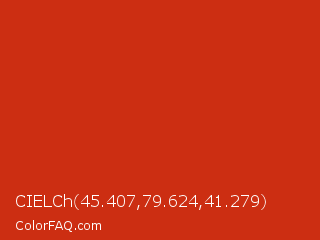 CIELCh 45.407,79.624,41.279 Color is a normal red color and the nearest color is Thunderbird #c02b18. Hex code #cc2e12 and RGB value is rgb(204,46,18). In RGB color space, this color is composed of 80% red, 18% green, 7% blue, In CMYK color space, this color is composed of 0% cyan, 77% magenta, 91% yellow , 20% black , In HSL color space, this color has a hue angle of 9° , 84% saturation and 44% lightness.