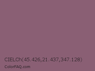 CIELCh 45.426,21.437,347.128 Color is a normal rose color and the nearest color is Mauve Taupe #915f6d. Hex code #8a5f74 and RGB value is rgb(138,95,116). In RGB color space, this color is composed of 54% red, 37% green, 45% blue, In CMYK color space, this color is composed of 0% cyan, 31% magenta, 16% yellow , 46% black , In HSL color space, this color has a hue angle of 331° , 18% saturation and 46% lightness.