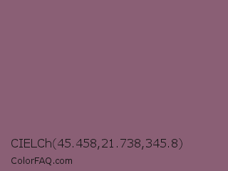 CIELCh 45.458,21.738,345.8 Color is a normal rose color and the nearest color is Mauve Taupe #915f6d. Hex code #8a5f75 and RGB value is rgb(138,95,117). In RGB color space, this color is composed of 54% red, 37% green, 46% blue, In CMYK color space, this color is composed of 0% cyan, 31% magenta, 15% yellow , 46% black , In HSL color space, this color has a hue angle of 329° , 18% saturation and 46% lightness.
