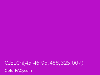 CIELCh 45.46,95.488,325.007 Color is a normal magenta color and the nearest color is Deep Magenta #cc00cc. Hex code #b90fc9 and RGB value is rgb(185,15,201). In RGB color space, this color is composed of 73% red, 6% green, 79% blue, In CMYK color space, this color is composed of 8% cyan, 93% magenta, 0% yellow , 21% black , In HSL color space, this color has a hue angle of 295° , 86% saturation and 42% lightness.