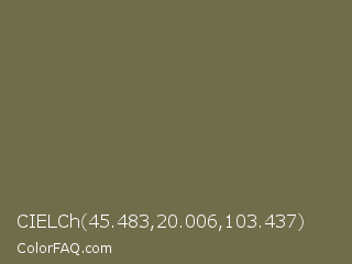 CIELCh 45.483,20.006,103.437 Color is a normal yellow color and the nearest color is Go Ben #726d4e. Hex code #706d4b and RGB value is rgb(112,109,75). In RGB color space, this color is composed of 44% red, 43% green, 29% blue, In CMYK color space, this color is composed of 0% cyan, 3% magenta, 33% yellow , 56% black , In HSL color space, this color has a hue angle of 55° , 20% saturation and 37% lightness.