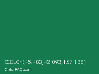 CIELCh 45.483,42.093,157.138 Color is a dark green color and the nearest color is Salem #097f4b. Hex code #157b4f and RGB value is rgb(21,123,79). In RGB color space, this color is composed of 8% red, 48% green, 31% blue, In CMYK color space, this color is composed of 83% cyan, 0% magenta, 36% yellow , 52% black , In HSL color space, this color has a hue angle of 154° , 71% saturation and 28% lightness.