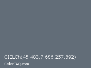 CIELCh 45.483,7.686,257.892 Color is a normal blue color and the nearest color is Nevada #646e75. Hex code #626d78 and RGB value is rgb(98,109,120). In RGB color space, this color is composed of 38% red, 43% green, 47% blue, In CMYK color space, this color is composed of 18% cyan, 9% magenta, 0% yellow , 53% black , In HSL color space, this color has a hue angle of 210° , 10% saturation and 43% lightness.