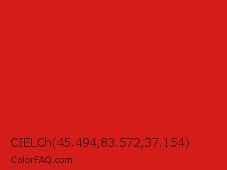 CIELCh 45.494,83.572,37.154 Color is a normal red color and the nearest color is Maximum Red #d92121. Hex code #d41c19 and RGB value is rgb(212,28,25). In RGB color space, this color is composed of 83% red, 11% green, 10% blue, In CMYK color space, this color is composed of 0% cyan, 87% magenta, 88% yellow , 17% black , In HSL color space, this color has a hue angle of 1° , 79% saturation and 46% lightness.