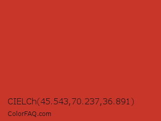 CIELCh 45.543,70.237,36.891 Color is a normal red color and the nearest color is International Orange Golden Gate Bridge #c0362c. Hex code #c73628 and RGB value is rgb(199,54,40). In RGB color space, this color is composed of 78% red, 21% green, 16% blue, In CMYK color space, this color is composed of 0% cyan, 73% magenta, 80% yellow , 22% black , In HSL color space, this color has a hue angle of 5° , 67% saturation and 47% lightness.