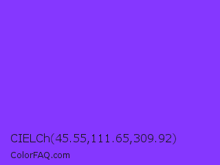 CIELCh 45.55,111.65,309.92 Color is a light violet color and the nearest color is Blue Violet #8a2be2. Hex code #8537ff and RGB value is rgb(133,55,255). In RGB color space, this color is composed of 52% red, 22% green, 100% blue, In CMYK color space, this color is composed of 48% cyan, 78% magenta, 0% yellow , 0% black , In HSL color space, this color has a hue angle of 263° , 100% saturation and 61% lightness.