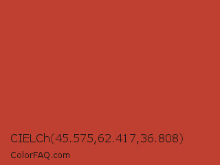 CIELCh 45.575,62.417,36.808 Color is a normal red color and the nearest color is Mojo #c04737. Hex code #bf4030 and RGB value is rgb(191,64,48). In RGB color space, this color is composed of 75% red, 25% green, 19% blue, In CMYK color space, this color is composed of 0% cyan, 66% magenta, 75% yellow , 25% black , In HSL color space, this color has a hue angle of 7° , 60% saturation and 47% lightness.
