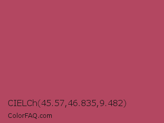 CIELCh 45.57,46.835,9.482 Color is a normal red color and the nearest color is Hippie Pink #ae4560. Hex code #b34761 and RGB value is rgb(179,71,97). In RGB color space, this color is composed of 70% red, 28% green, 38% blue, In CMYK color space, this color is composed of 0% cyan, 60% magenta, 46% yellow , 30% black , In HSL color space, this color has a hue angle of 346° , 43% saturation and 49% lightness.