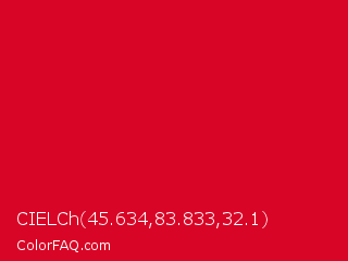 CIELCh 45.634,83.833,32.1 Color is a normal red color and the nearest color is Medium Candy Apple Red #e2062c. Hex code #d90526 and RGB value is rgb(217,5,38). In RGB color space, this color is composed of 85% red, 2% green, 15% blue, In CMYK color space, this color is composed of 0% cyan, 98% magenta, 82% yellow , 15% black , In HSL color space, this color has a hue angle of 351° , 95% saturation and 44% lightness.