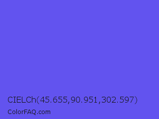 CIELCh 45.655,90.951,302.597 Color is a light indigo color and the nearest color is Majorelle Blue #6050dc. Hex code #6253ef and RGB value is rgb(98,83,239). In RGB color space, this color is composed of 38% red, 33% green, 94% blue, In CMYK color space, this color is composed of 59% cyan, 65% magenta, 0% yellow , 6% black , In HSL color space, this color has a hue angle of 246° , 83% saturation and 63% lightness.