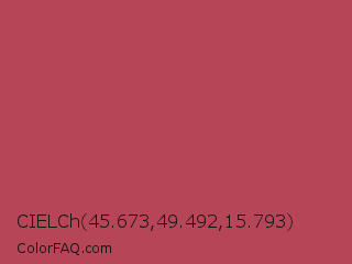 CIELCh 45.673,49.492,15.793 Color is a normal red color and the nearest color is Hippie Pink #ae4560. Hex code #b74558 and RGB value is rgb(183,69,88). In RGB color space, this color is composed of 72% red, 27% green, 35% blue, In CMYK color space, this color is composed of 0% cyan, 62% magenta, 52% yellow , 28% black , In HSL color space, this color has a hue angle of 350° , 45% saturation and 49% lightness.