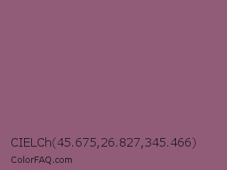 CIELCh 45.675,26.827,345.466 Color is a normal rose color and the nearest color is Antique Fuchsia #915c83. Hex code #915c78 and RGB value is rgb(145,92,120). In RGB color space, this color is composed of 57% red, 36% green, 47% blue, In CMYK color space, this color is composed of 0% cyan, 37% magenta, 17% yellow , 43% black , In HSL color space, this color has a hue angle of 328° , 22% saturation and 46% lightness.
