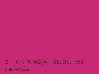 CIELCh 45.683,64.785,357.569 Color is a normal rose color and the nearest color is Telemagenta #cf3476. Hex code #c72a73 and RGB value is rgb(199,42,115). In RGB color space, this color is composed of 78% red, 16% green, 45% blue, In CMYK color space, this color is composed of 0% cyan, 79% magenta, 42% yellow , 22% black , In HSL color space, this color has a hue angle of 332° , 65% saturation and 47% lightness.