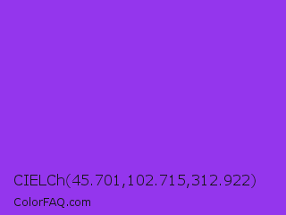 CIELCh 45.701,102.715,312.922 Color is a normal purple color and the nearest color is Blue Violet #8a2be2. Hex code #9436ed and RGB value is rgb(148,54,237). In RGB color space, this color is composed of 58% red, 21% green, 93% blue, In CMYK color space, this color is composed of 38% cyan, 77% magenta, 0% yellow , 7% black , In HSL color space, this color has a hue angle of 271° , 84% saturation and 57% lightness.
