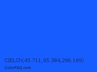 CIELCh 45.711,95.384,296.169 Color is a normal blue color and the nearest color is Blue Ribbon #0066ff. Hex code #175cff and RGB value is rgb(23,92,255). In RGB color space, this color is composed of 9% red, 36% green, 100% blue, In CMYK color space, this color is composed of 91% cyan, 64% magenta, 0% yellow , 0% black , In HSL color space, this color has a hue angle of 222° , 100% saturation and 55% lightness.