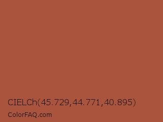 CIELCh 45.729,44.771,40.895 Color is a normal red color and the nearest color is Brown Rust #af593e. Hex code #aa533d and RGB value is rgb(170,83,61). In RGB color space, this color is composed of 67% red, 33% green, 24% blue, In CMYK color space, this color is composed of 0% cyan, 51% magenta, 64% yellow , 33% black , In HSL color space, this color has a hue angle of 12° , 47% saturation and 45% lightness.
