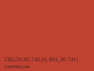 CIELCh 45.742,61.891,36.741 Color is a normal red color and the nearest color is Mojo #c04737. Hex code #bf4131 and RGB value is rgb(191,65,49). In RGB color space, this color is composed of 75% red, 25% green, 19% blue, In CMYK color space, this color is composed of 0% cyan, 66% magenta, 74% yellow , 25% black , In HSL color space, this color has a hue angle of 7° , 59% saturation and 47% lightness.